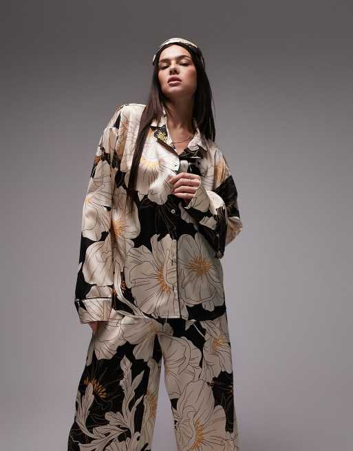 Topshop satin floral print piped shirt and pants pyjama set with eye mask in black