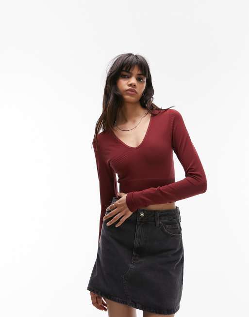 Topshop seamless long sleeve v neck crop top in dark red