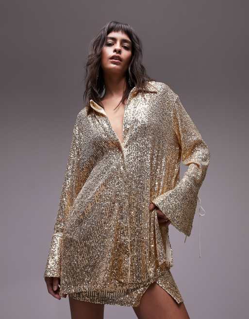 Topshop sequin oversized shirt in champagne (part of a set)