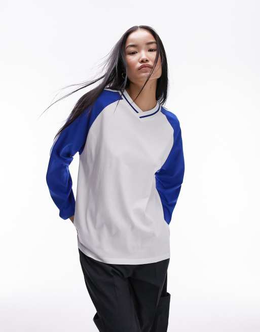 Topshop sporty skater colour block long sleeve tee in cobalt