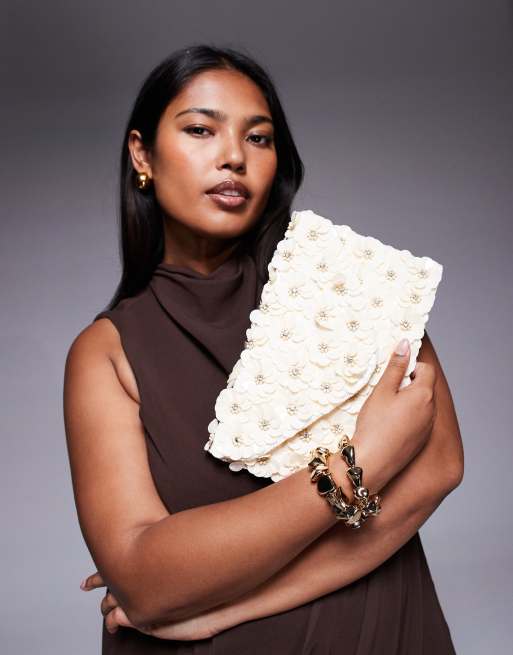 True Decadence 3D flower embellished envelope clutch bag with crossbody strap in off white