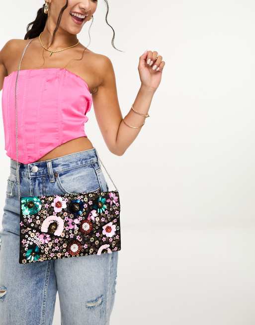 True Decadence floral beaded bag in black and pink