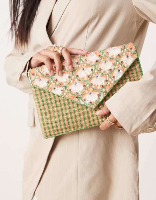 True Decadence floral beaded envelope clutch bag in pink and green