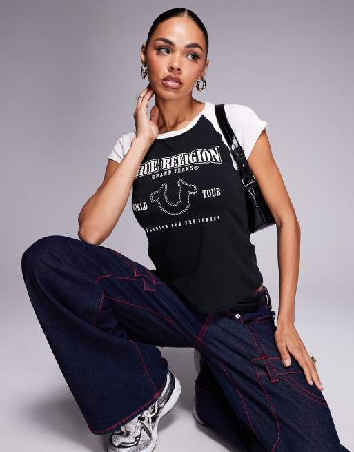 True Religion logo detail raglan baby tee in black & white