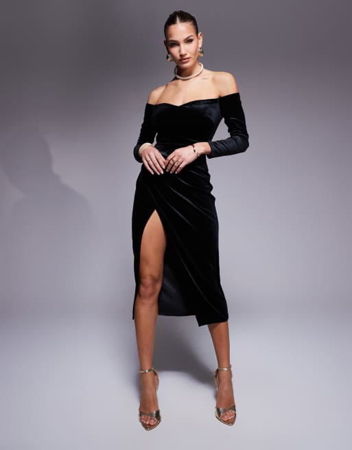 True Violet velvet bardot long sleeve midaxi dress with thigh split in black