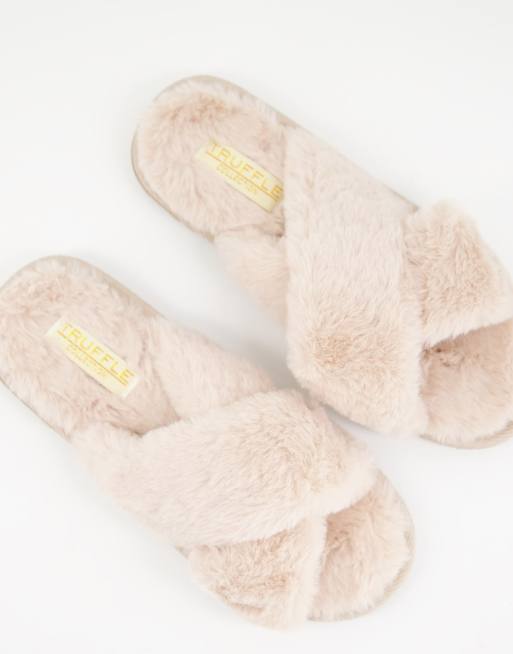 Truffle Collection fluffy cross strap slippers with chunky sole in taupe