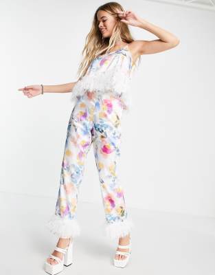 Twisted Wunder straight leg pants in floral print with faux-feather hem (Part of a set)