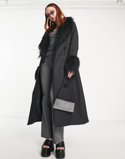 Urban Code longline trench coat with faux shaggy fur collar in black