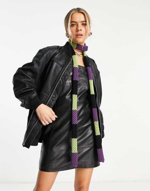 Urbancode real leather oversized bomber jacket in black