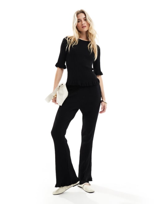 Vero Moda Aware knitted lettuce edged top and flared pants set in black