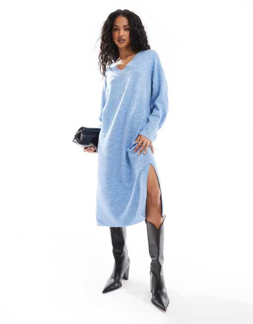 Vero Moda oversized knitted v neck midi dress in blue melange