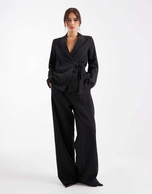 Vero Moda tailored wide leg pants and tie side blazer set in dark grey melange