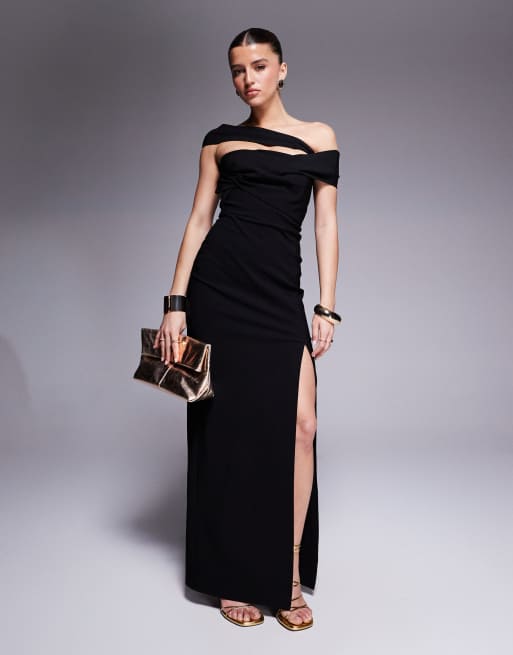 Vesper bengaline one shoulder twist front side split maxi dress in black