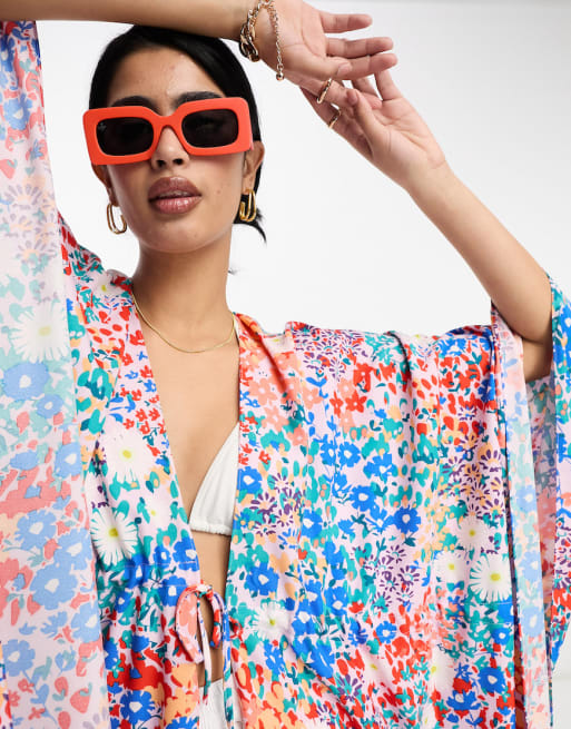 Vila plunge swimsuit and beach kaftan in blue mixed floral