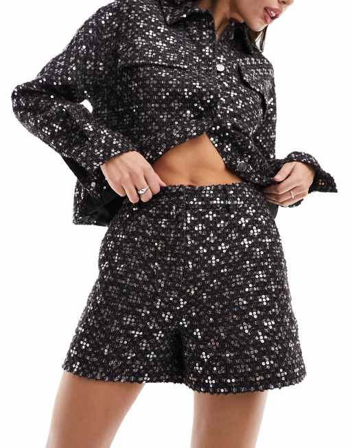 Vila tailored boucle sequin shorts in washed black (part of a set)