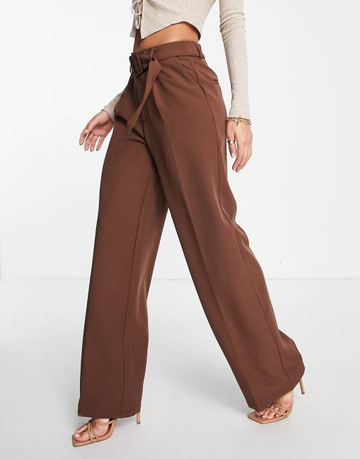 Vila tailored suit wide leg pants with belt in chocolate brown