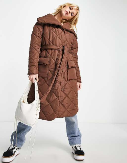 Violet Romance quilted shawl neck longline coat with belt in chocolate brown