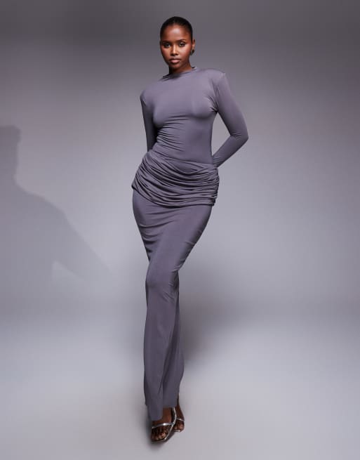 Wanderdoll Ashtin second skin shoulder pad high neck long sleeve bodysuit and maxi skirt set in grey