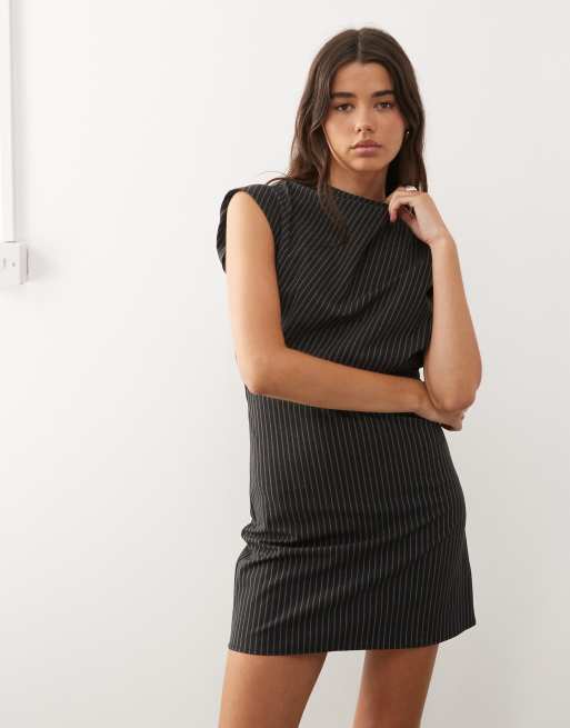 Weekday slash neck mini dress with open back in dark grey pinstripe