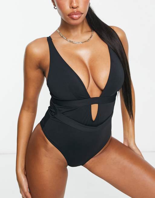 Wolf & Whistle Fuller Bust Exclusive strappy plunge swimsuit in black