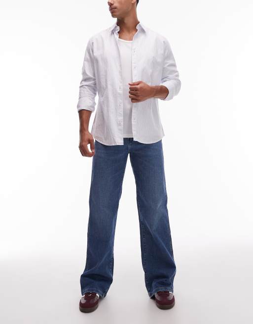 - Non-stretch denim: mid-blue wash