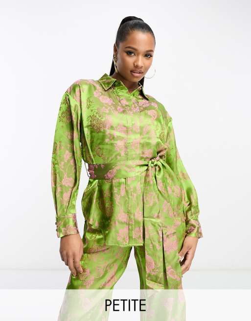 Y.A.S Petite floral jacquard belted shirt in green and pink (part of a set)