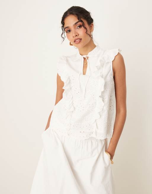 YAS broderie frill detail tie neck top in white (part of a set)