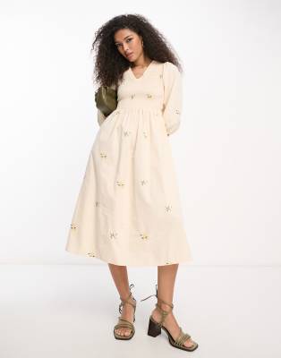 Y.A.S shirred bodice smock midi dress with floral embroidery in cream