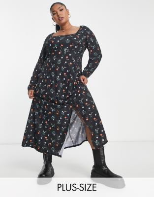 Yours Exclusive square neck long sleeve midi dress with side split in black ditsy floral