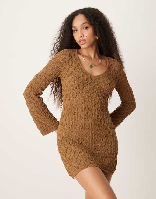 AWARE crochet knit mini dress with wide sleeves in brown