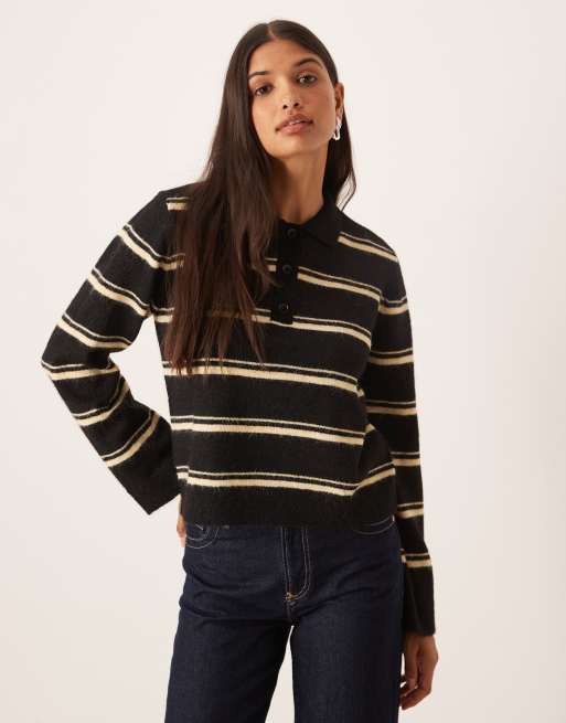 AWARE hairy yarn knitted rugby polo style jumper in black and cream stripe