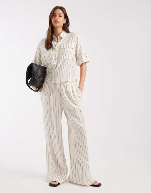 AWARE linen blend high waist wide leg trouser co-ord in white and black stripe