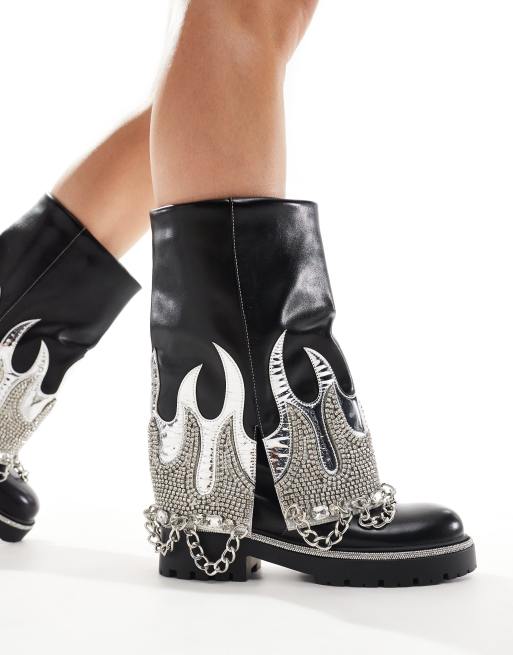 Azalea Wang Florentine silver flame embellished chunky foldeover boots in black