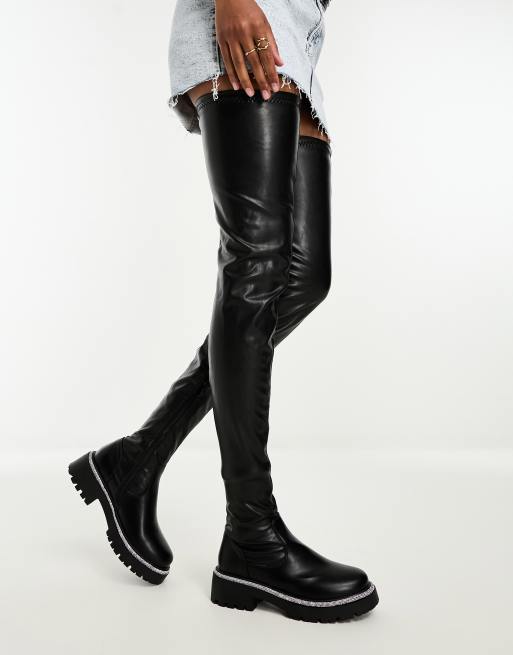 Azalea Wang Newrules over the knee boot with diamante trim in black