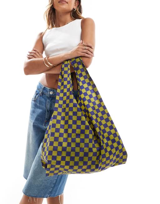 Baggu shopper tote bag in green and blue checkerboard print