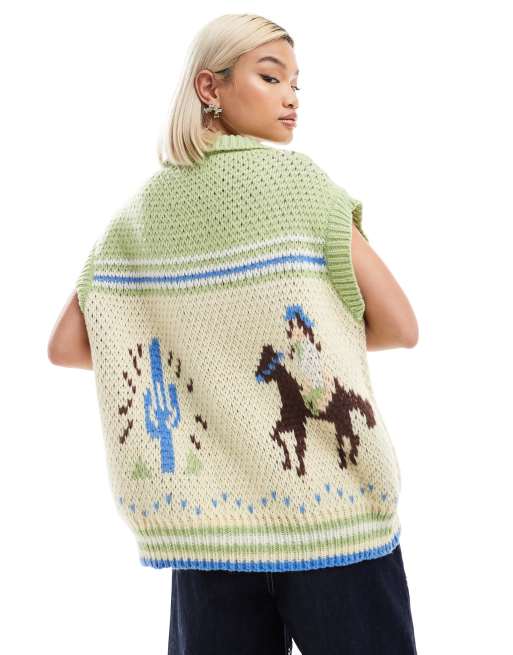 Bailey Rose oversized zip up retro knitted vest with cowboy print