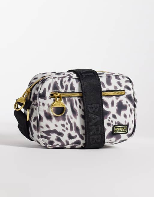 Barbour International Boulevard leopard print logo micro crossbody bag in purple