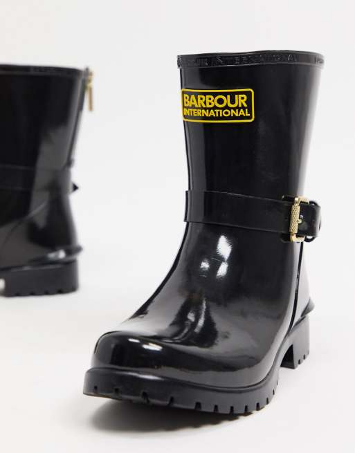 Barbour international low shiny biker wellington boots with buckle and zip detail