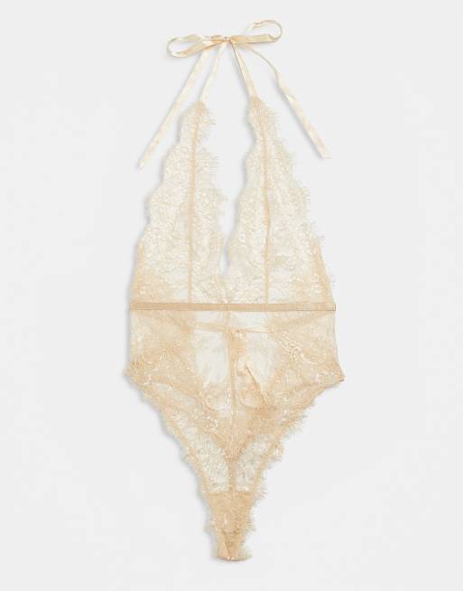 Bardot leonora lace plunge neck halter tie detail bodysuit in gold