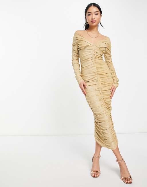 Bardot off shoulder ruched mini dress in metallic gold knit