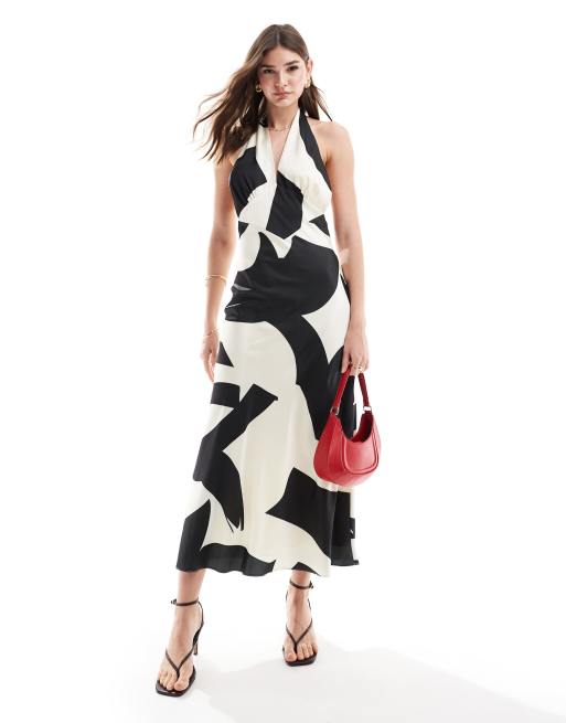 Bardot satin halterneck maxi dress in abstract print in mono