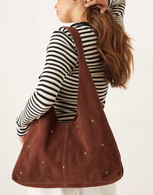 Barneys Originals Real suede slouch shoulder bag in brown with studs in brown