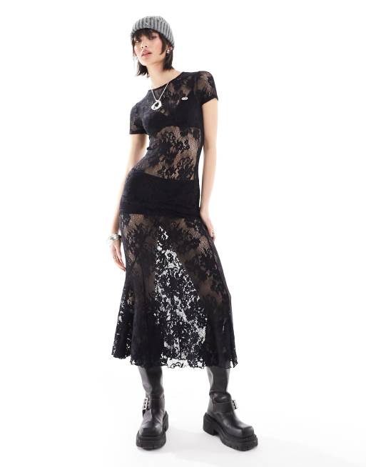 Basic Pleasure Mode short sleeve lace maxi dress in black
