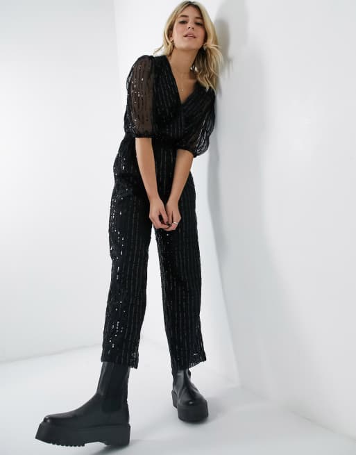 BB Dakota sequin jumpsuit with sheer sleeves in black