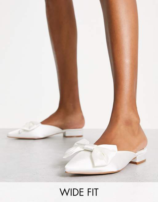 Be Mine Wide Fit Bridal backless flat shoes with bow detail in ivory satin