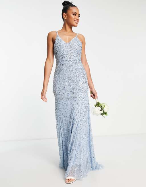 Beauut Bridesmaid allover embellished maxi dress with train in light blue