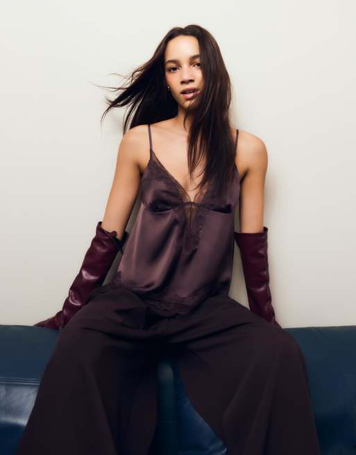 Bershka Asymmetric sateen lace camisole top in brown
