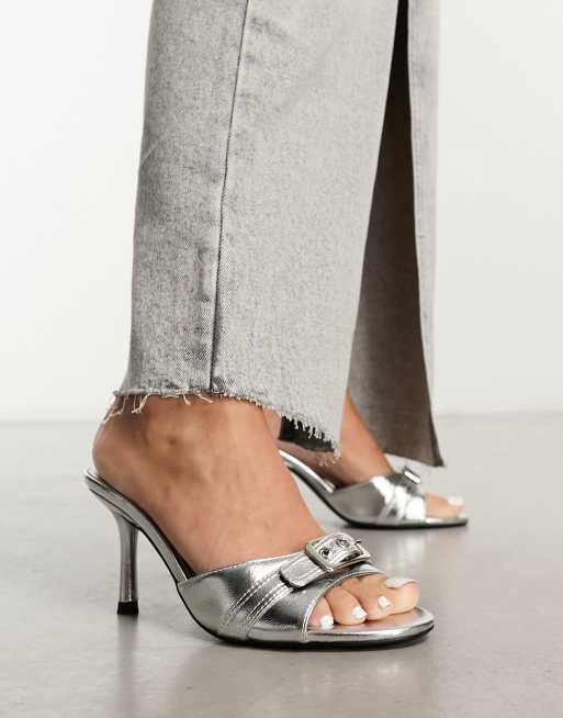 Bershka buckle detail low heeled sandals in metallic silver