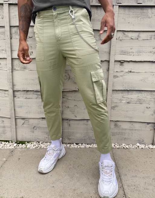 Bershka cargo trousers with chain in khaki