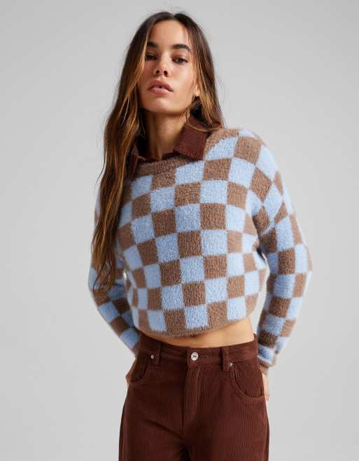 Bershka checkerboard jumper in blue and brown